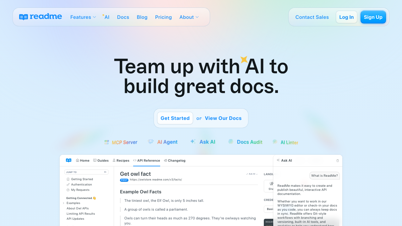 ReadMe offers documentation creators an MDX-based workflow with interactive capabilities. Users can include live code samples, API request/response explorers, and a set of built-in components like tabs, callouts, and alerts. ReadMe also supports custom MDX components authored through its Custom Components interface, with Tailwind CSS styling and a community component marketplace. These features make it easier to produce polished, user-friendly API documentation quickly, without needing extensive front-end development experience.