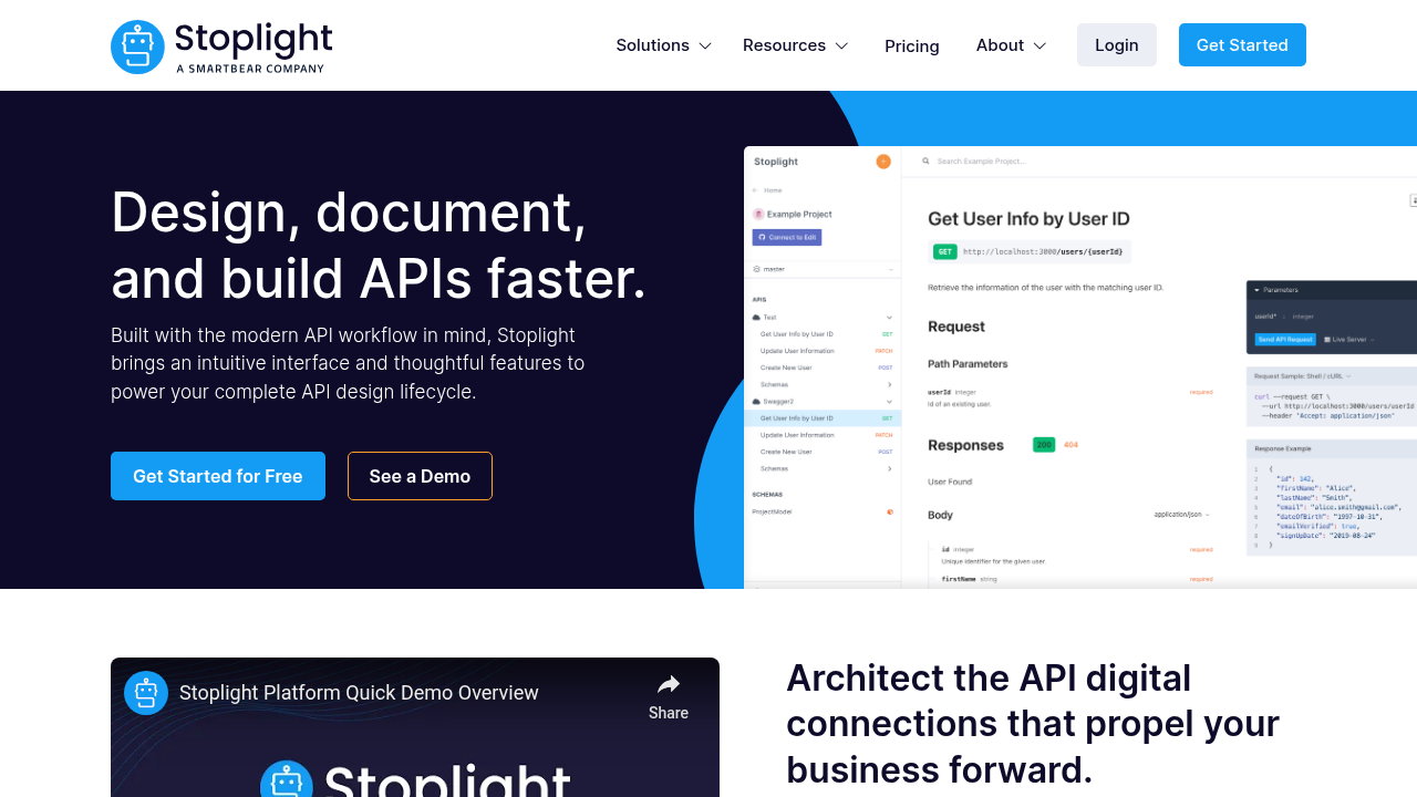 - Design APIs visually through a form-based editor or directly in OpenAPI/JSON Schema.