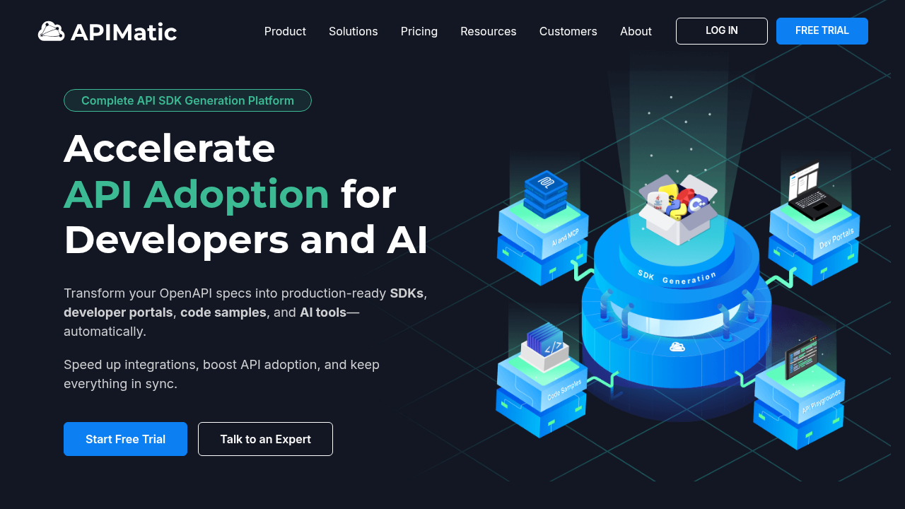 APIMatic operates as a hosted service that converts API specifications into client libraries. It focuses on transforming standard definitions into code across various programming environments through a web-based interface.